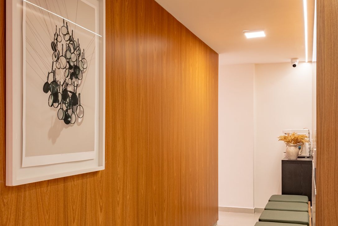 O ponto de partida para esse projeto foi pensar pontos de conexão entre a parte antiga da clínica com a parte nova, a fim de estabelecer uma unidade visual. Visto a cor branca como predominante, a ideia então foi trabalhar diferentes texturas de branco com intuito de quebrar a monotonia e trazer espaços mais estimulantes e agradáveis. Utilizamos painéis em lambri, ripados e portas metálicas perfuradas. A madeira chega para trazer conforto na área de espera e o preto, pontualmente em alguns mobiliários e detalhes, uma linguagem contemporânea ao projeto.